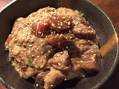 昨晩仕込んだ鮪の漬けをおろした長芋(とろろ)に入れて混ぜたんだけど、とろろに醤油の色がのってしまい、見た目は写真の通リです。
